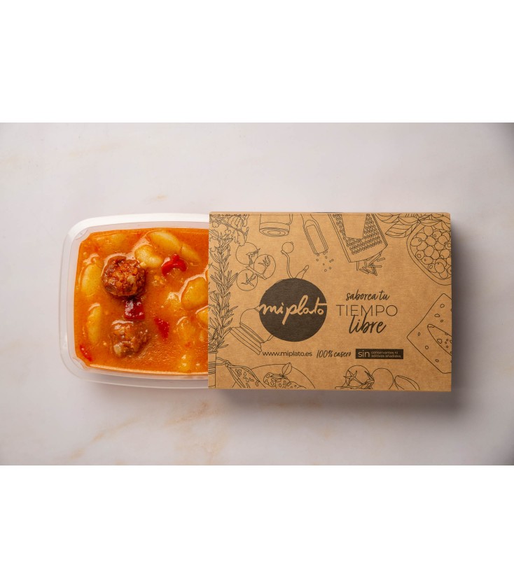 Ingredientes: Alubia [alubia blanca y sal (SULFITOS)](37%); agua; patata; chorizo (Carne de cerdo ibérico, pimentón, sal, ajo, fermentos lácticos, antioxidantes E-301 y E-330, dextrosa, aroma de humo,...